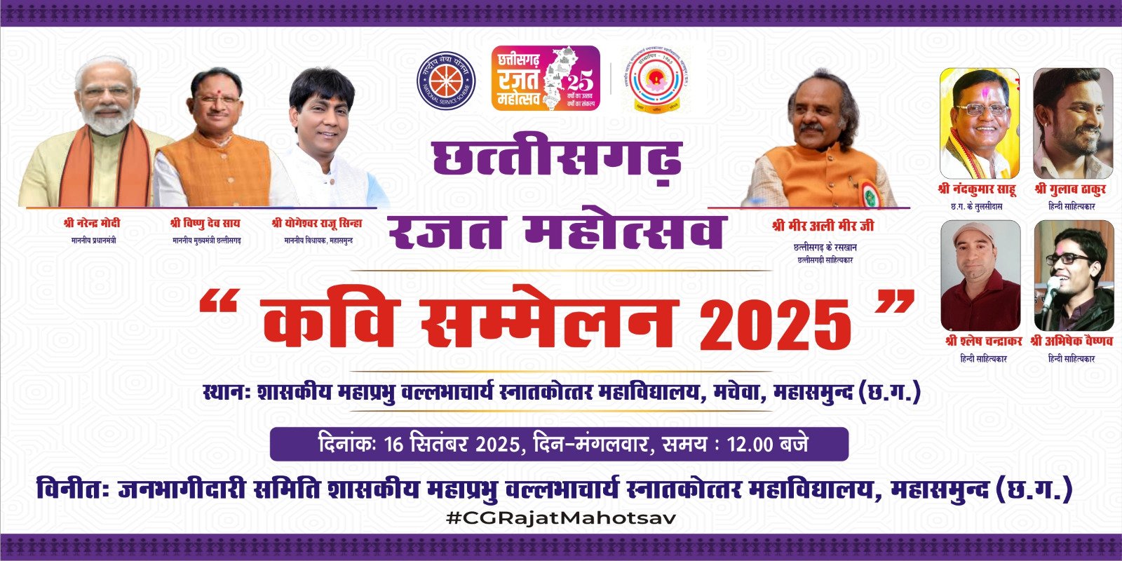 @छत्तीसगढ़ लोकदर्शन, महासमुंद। छत्तीसगढ़ राज्य की स्थापना के 25 वर्ष पूर्ण होने के गौरवपूर्ण अवसर पर शासकीय महाप्रभु वल्लभाचार्य स्नातकोत्तर महाविद्यालय, महासमुंद में एक विशेष कवि सम्मेलन आयोजित किया जा रहा है। महाविद्यालय की प्राचार्य करुणा दुबे, हिंदी विभागाध्यक्ष डॉ. दुर्गावती भारतीय, रासेयो जिला संगठक डॉ. मालती तिवारी तथा जनभागीदारी प्रबंधन समिति के संयुक्त प्रयास से यह कार्यक्रम 16 सितंबर 2025 को आयोजित होगा।