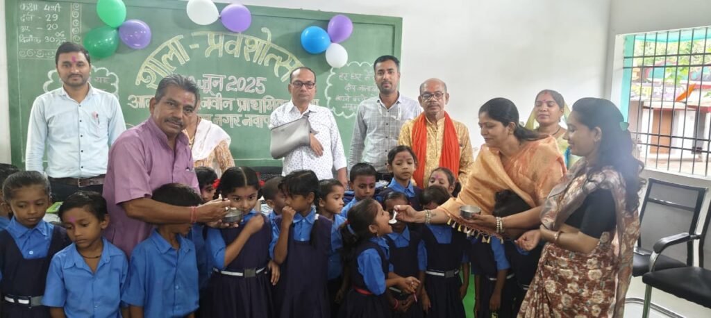 @छत्तीसगढ़ लोकदर्शन, नवापारा राजिम। नवापारा नगर के आदर्श शासकीय प्राथमिक शाला दीनदयाल नगर में शाला प्रवेश उत्सव का आयोजन किया गया। कार्यक्रम में मुख्य अतिथि भाजपा नेत्री एवं समाजसेवी योगिता सिन्हा, विशेष अतिथि पूर्व पार्षद मयाराम साहू , पार्षद लोमेश्वरी साहू, पालक समिति अध्यक्ष कृति बया, प्रधान पाठक गोपाल यादव उपस्थित रहे। कार्यक्रम की शुरुआत मां सरस्वती की पूजा कर की गई। नवप्रवेशी छात्रों को तिलक लगाकर शाला में स्वागत किया गया। छात्रों का खीर से मुंह मीठा कराया गया।