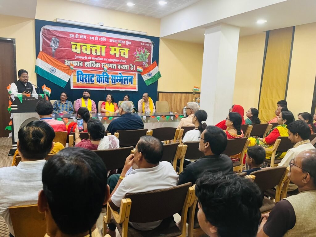 @छत्तीसगढ़ लोकदर्शन, रायपुर। अग्रणी सामाजिक एवं साहित्यिक संस्था वक्ता मंच की ओर से राजधानी रायपुर के वृन्दावन सभागृह में भव्य देशभक्ति पूर्ण काव्य गोष्ठी का आयोजन किया गया। गणेशोत्सव की ऐतिहासिक परंपरा से प्रेरित इस कार्यक्रम में रायपुर, दुर्ग, सिमगा, राजिम और बेमेतरा से आए 60 से अधिक कवियों ने हिंदी और छत्तीसगढ़ी भाषा में ओजस्वी काव्य पाठ कर सभागृह को देशभक्ति की भावना से सराबोर कर दिया।